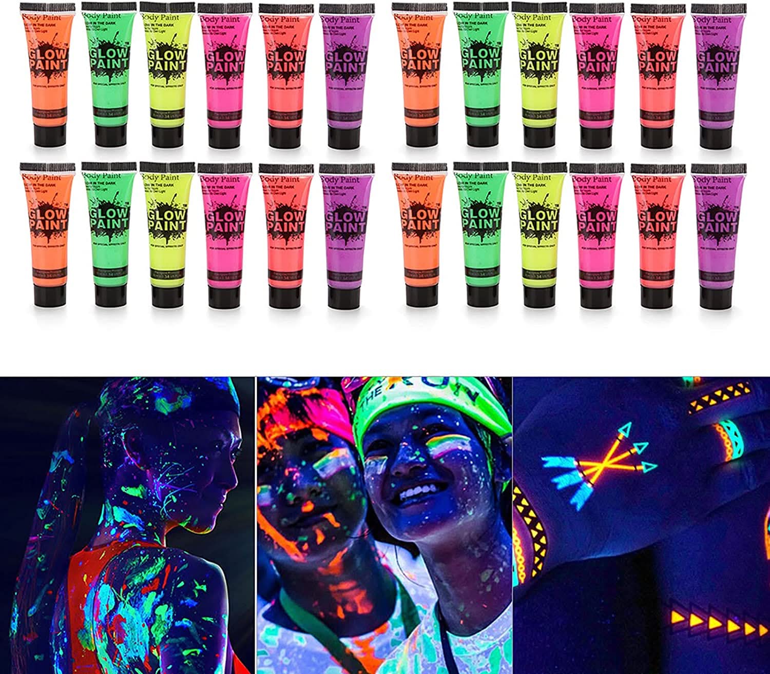 24 Tubes 25ml Art Body Paint Glow inLight Face & Body Paint with 6 Colors Glow Blacklight Neon Fluorescent for Party Clubbing Festival Halloween Makeup