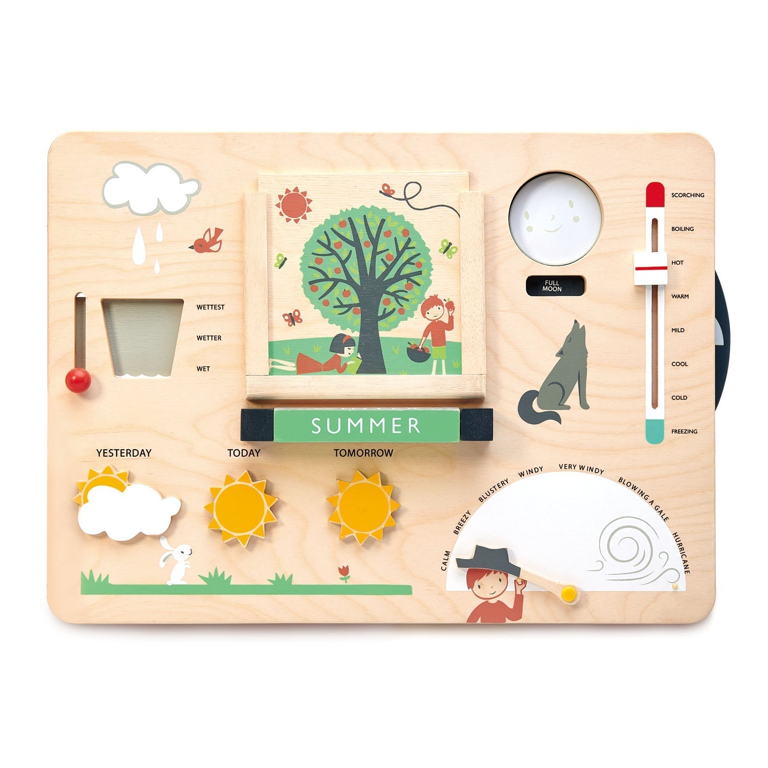 A top-quality illustrated wood Weather station that links all aspects of climate into a simple and educational board that can be hung up on a classroom wall or played with on a tabletop. Rainfall, wind speed, temperature, seasons and a daily 'what is the weather like today' as well as a novel moon phase wheel teaches about cycles.