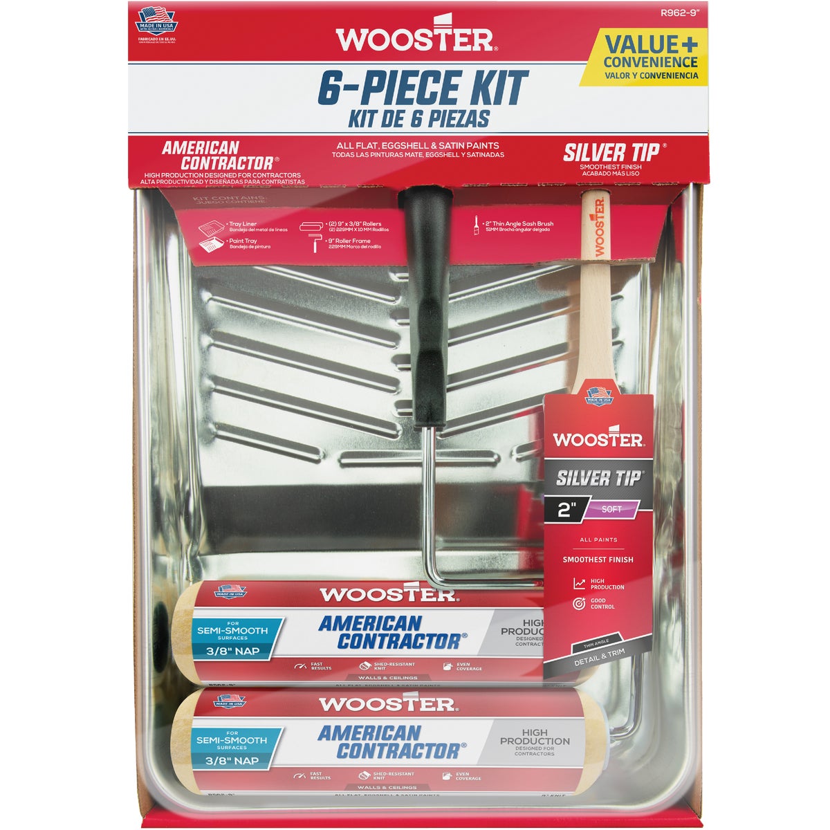 6-piece roller and tray set contains: (1) 9 In. 5-wire cage frame, (2) American Contractor 9 In. x 3/8 In. knit rollers, (1) Silver Tip 2 In. thin angle sash brush, (1) deluxe metal tray, and (1) deluxe tray liner. Roller cover is first choice for value and performance in a production cover, excellent paint pickup and release. For use with all paints (flat, eggshell, and satin). Paint brush is made of white and silver CT polyester filaments for excellent leveling and smoothing. %search_data%R962-9